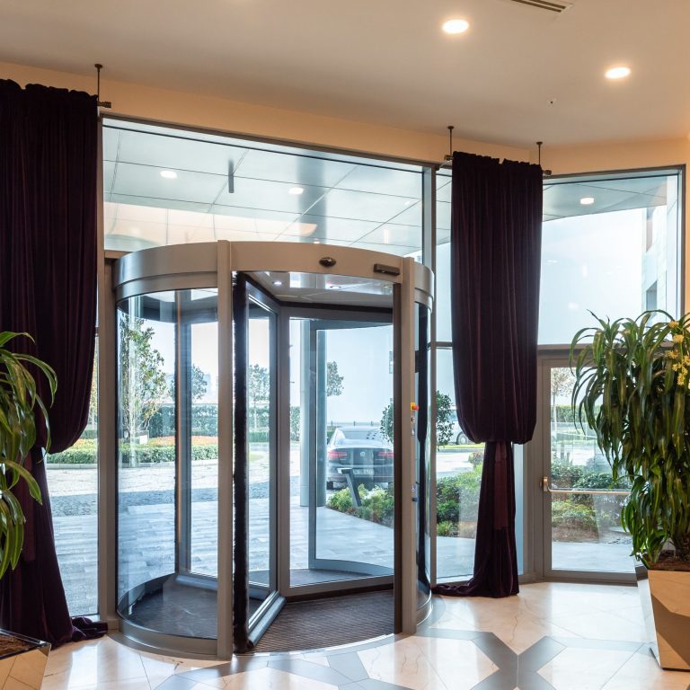 Sliding doors are good alternatives which lets using big glasses for entry function.